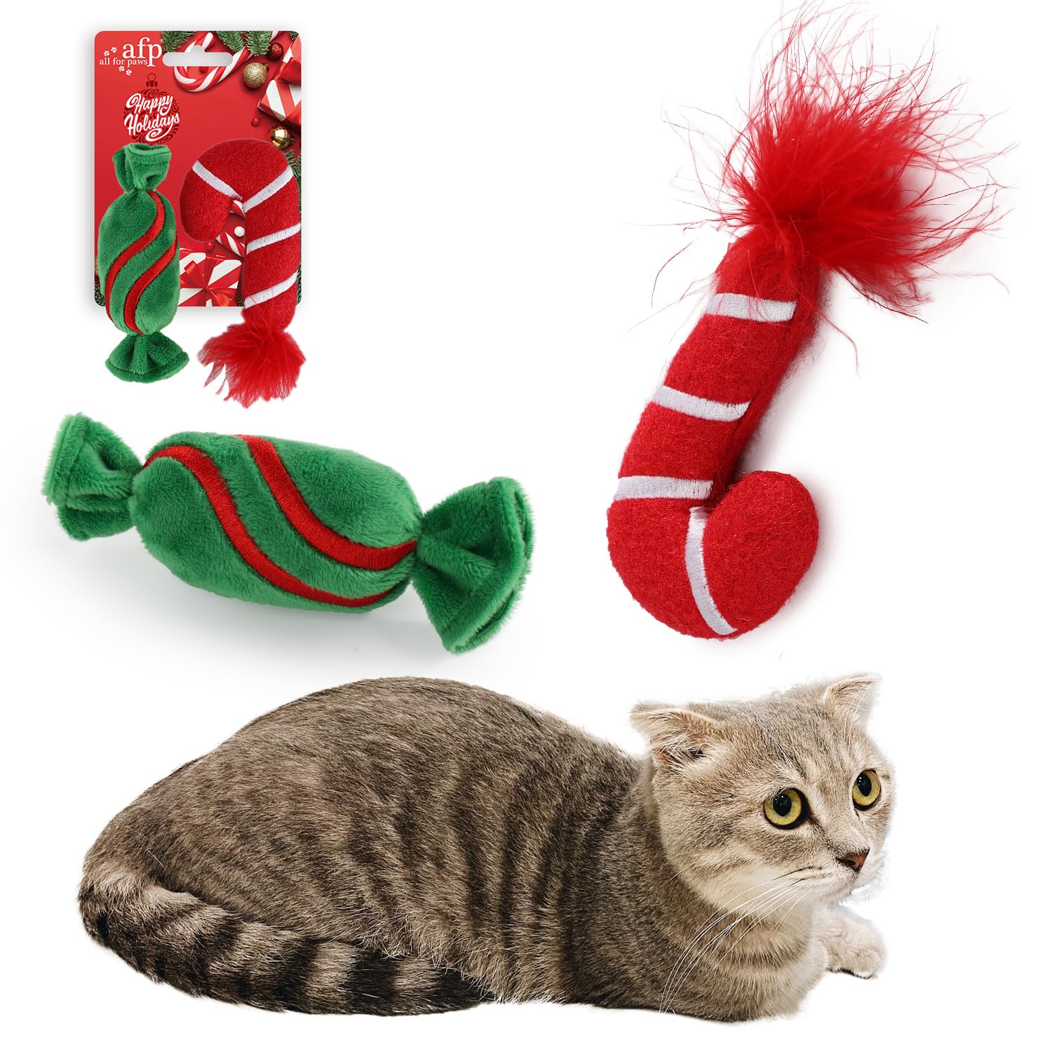 ALL FOR PAWS Christmas Cat Toys Happy Holiday Kitten Toys with Catnip, Crinkle Sound 2 Set Candy Cane Designs Kitty Toy