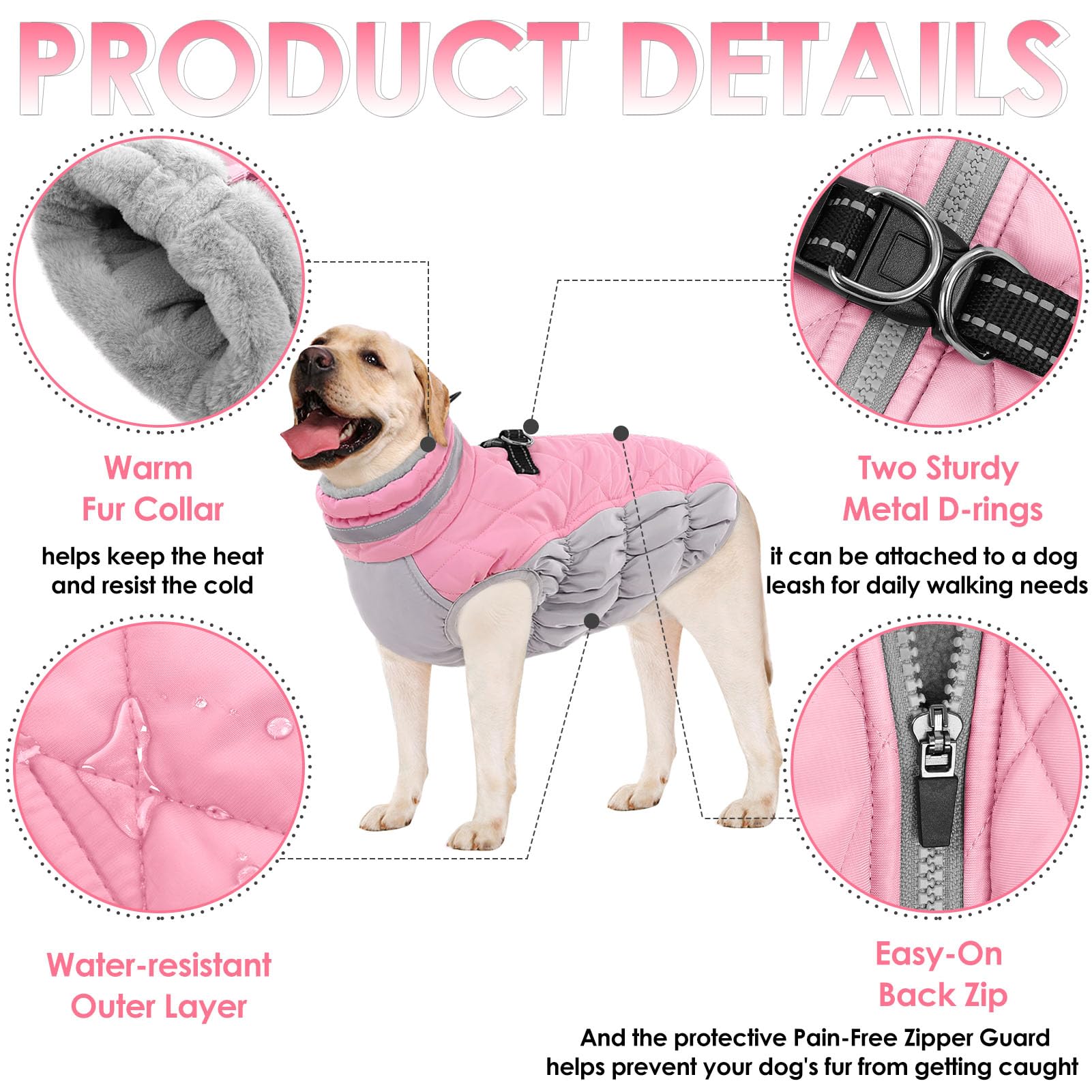 - ELASTIC ABDOMEN DESIGN, PAINLESS ZIPPER CLOSURE FOR EASY ON & OFF: The waterproof dog coat is equipped with zip on the back, elastic chest and sleeveless design, very easy to put on and take off. The protective Pain-Free Zipper Guard on the dog sweater prevents dog fur and skin from getting accidentally zipped