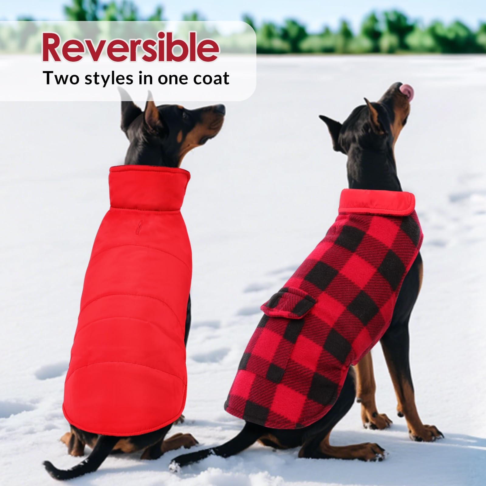 - CREATIVE DESIGN: The dog winter jackets can be two-sided worn, with the magic sticker closures around the neck & belly that can easy to adjust the size to fit your dog, also easy to wear and take off. The Plaid fabric side also has a pocket on the back, you can store some small things in it.