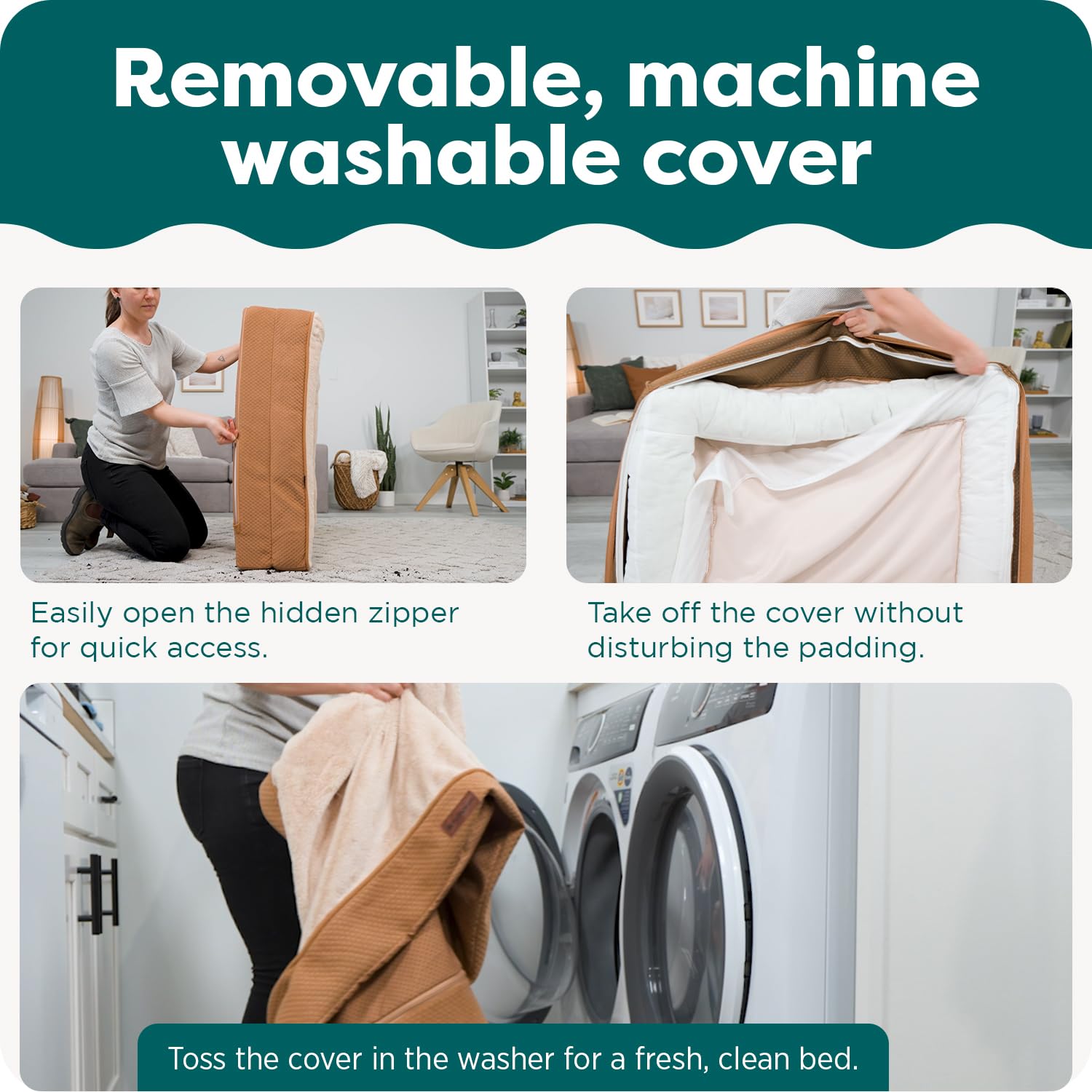 • Wash it, dry it, done: A dirty pet bed can fill your home with odors and allergens. Our medium washable dog bed makes cleanup effortless. The zippered, removable cover is fully machine washable, allowing you to easily lift away shed fur and dander for a truly hygienic sleep space.