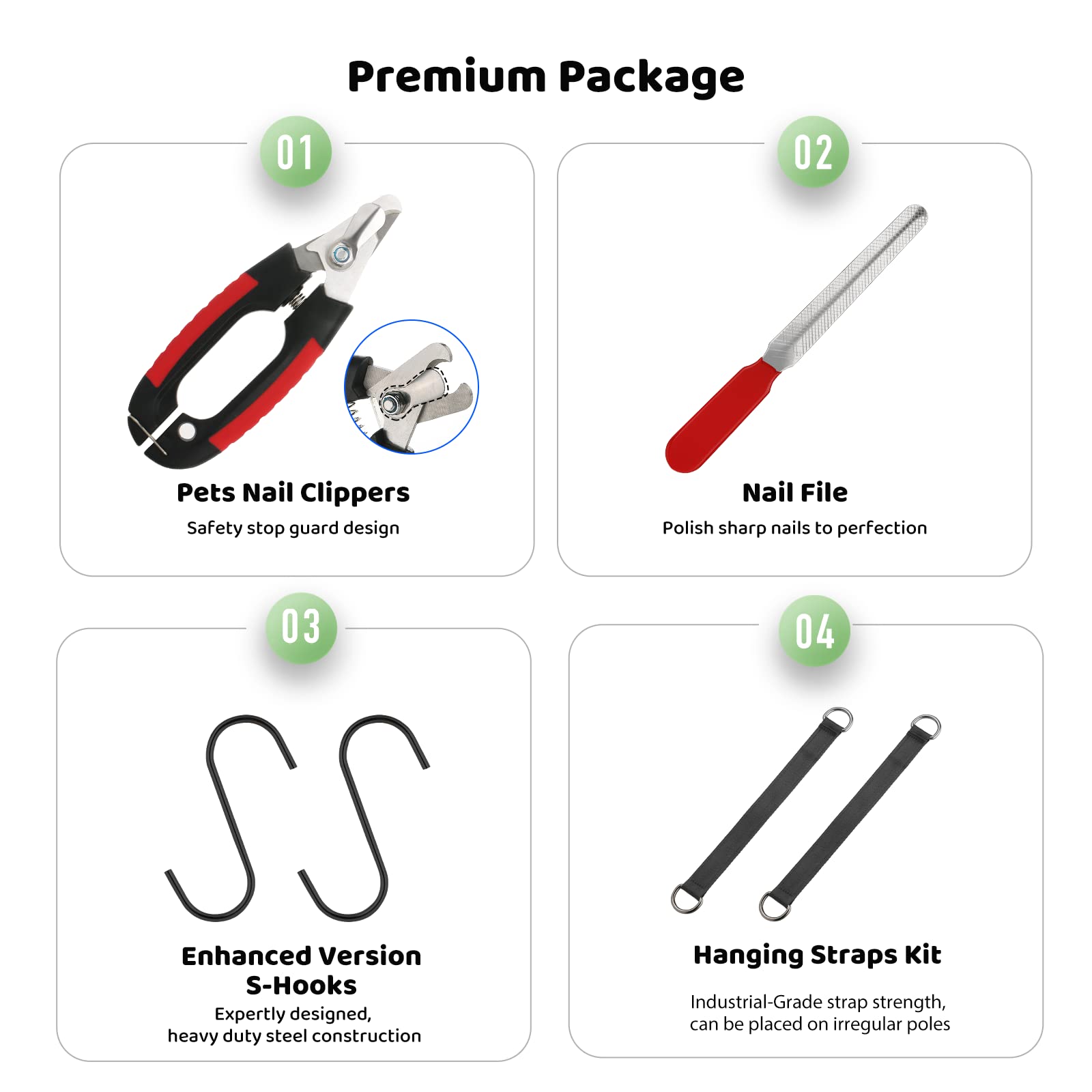 • Comes as a full cat nail clipper hammock kit—safety belt, nail clipper (with stop guard), nail file, 2 S-hooks & adjustable slings for cat clippers for nails