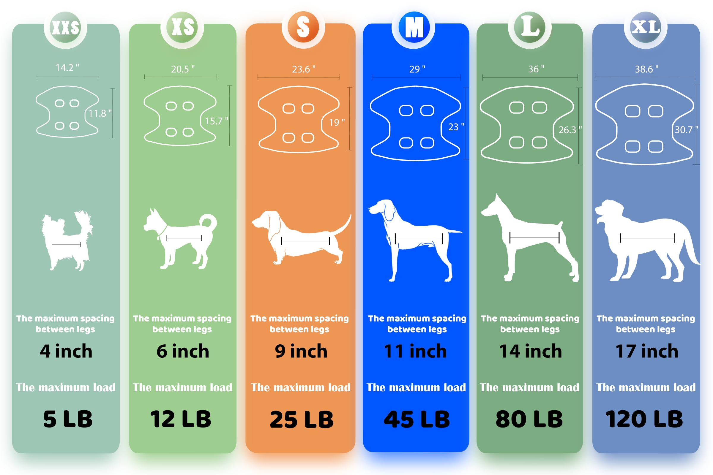 • Please read the size chart and measure the spacing between the Front and Rear Legs (3.5 – 7 inches) / Weight (Under 12 lb) for your pets before purchasing. If you have another question, please connect us.