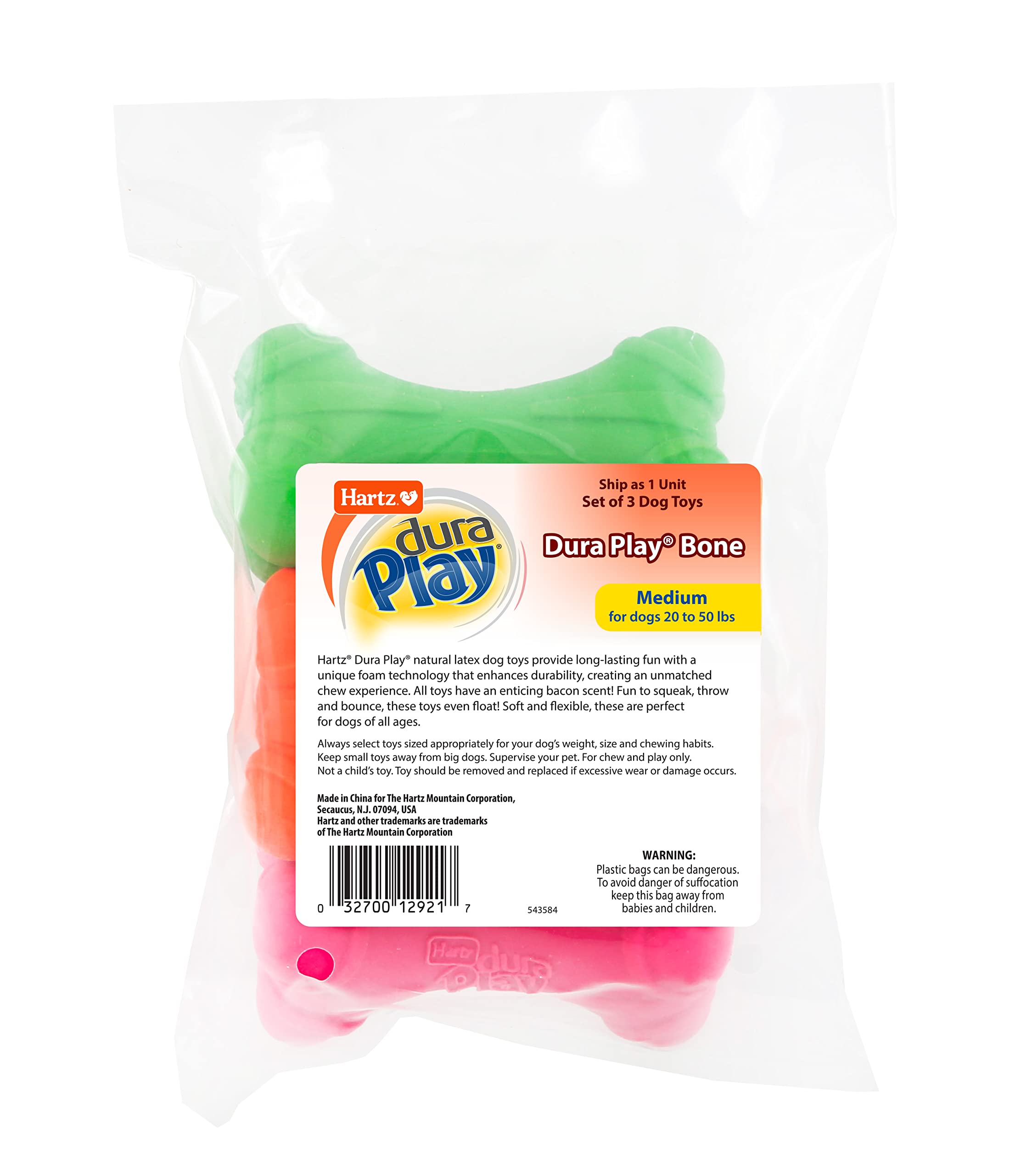 Hartz DuraPlay Bone Squeaky Latex Dog Toy for Medium Breeds, 3 Pack