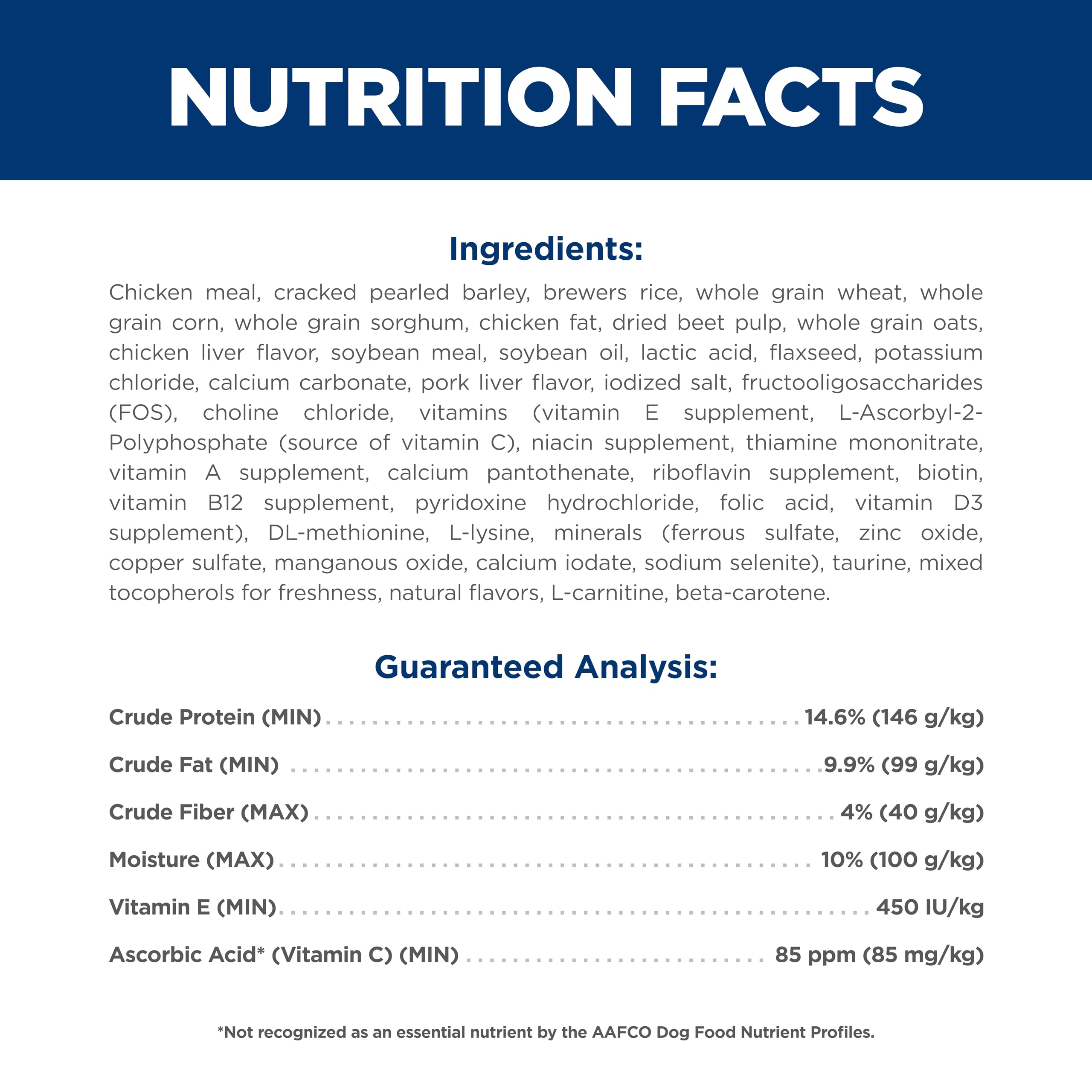 Hill’s uses only high-quality ingredients including real chicken, lamb or salmon protein. Hill’s dry pet foods have quality protein as the first ingredient and provide clinically proven antioxidant benefits. Plus, they’re made with natural ingredients (plus vitamins, minerals & amino acids) and never contain artificial colors, flavors, preservatives or chicken by-product meal.