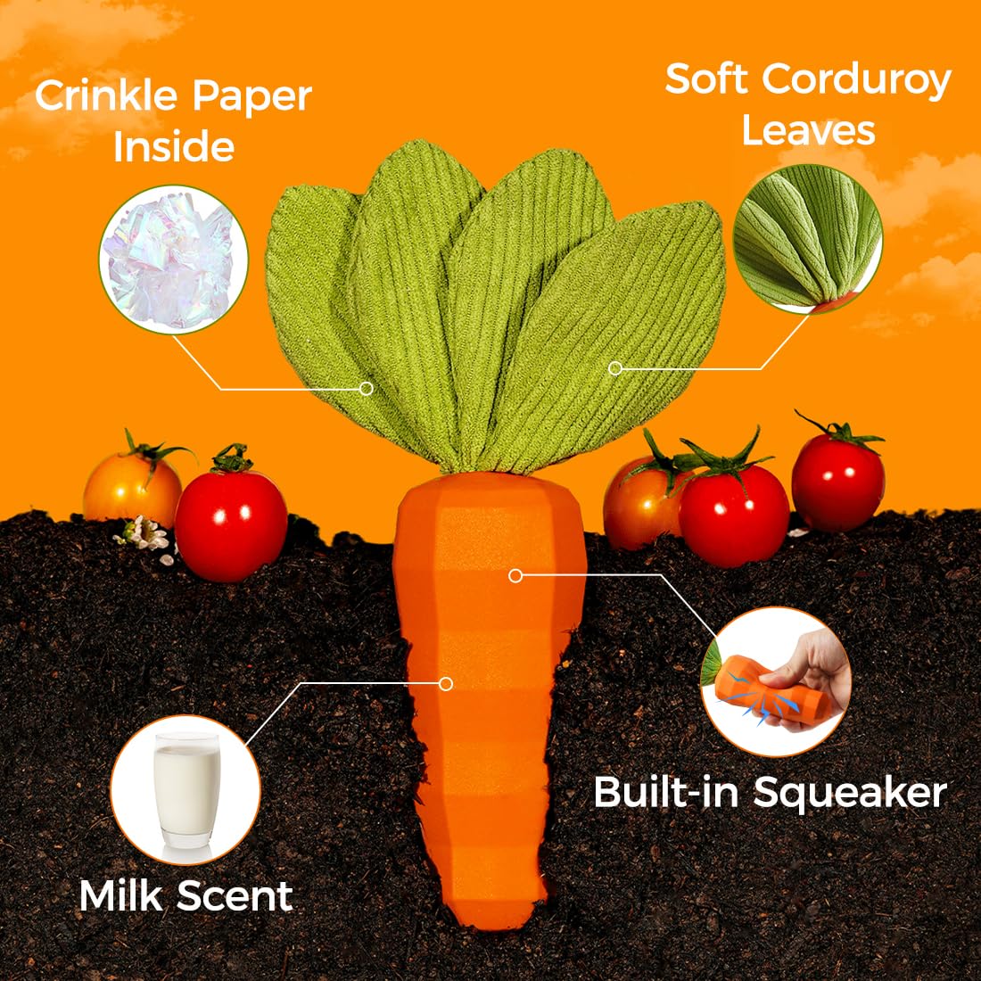 - Green Leaves made of no stuffing plush with crinkle paper inside. Orange Carrot Body made of natural rubber. Toy dimensions is 9 in * 1.8 in.