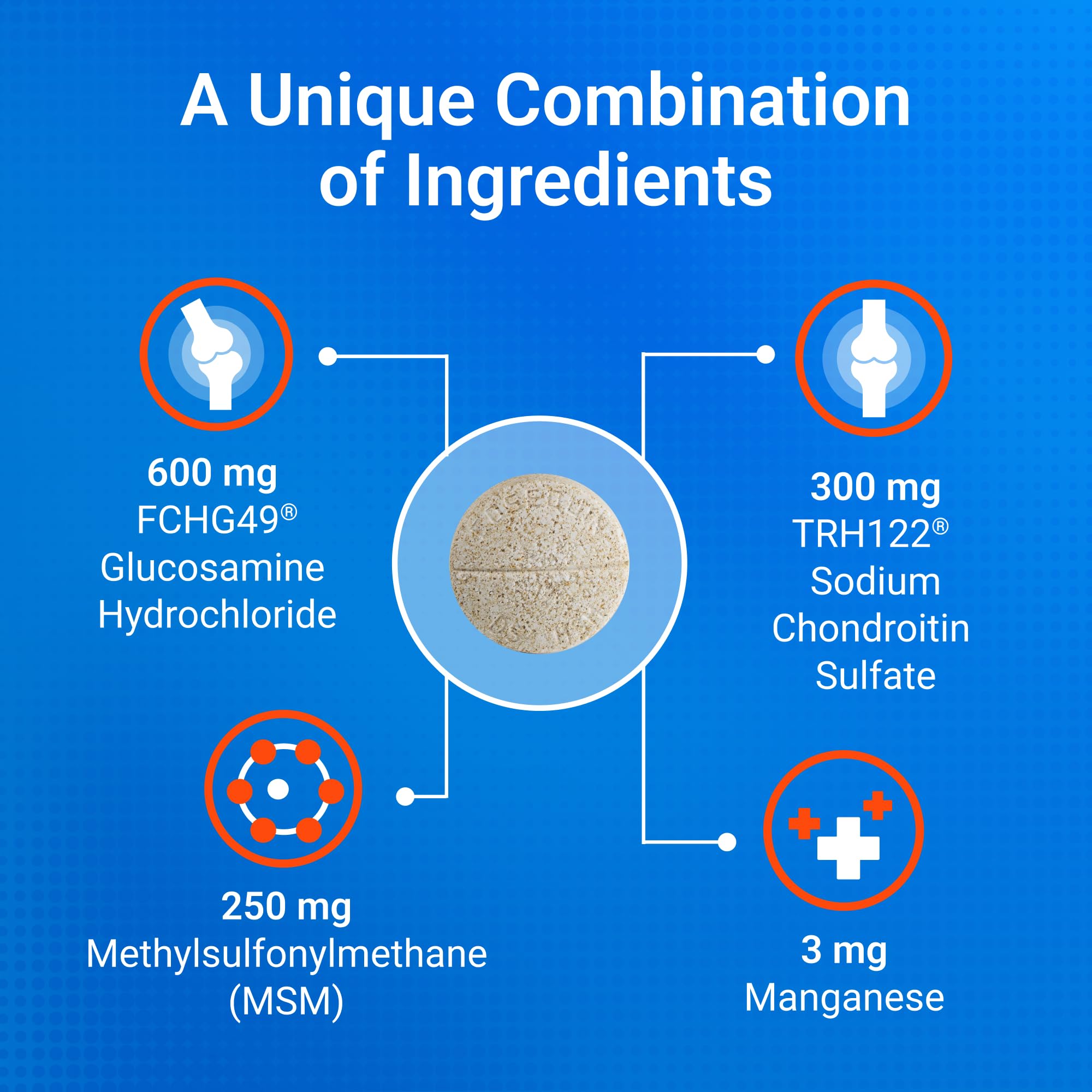 - Contains Glucosamine for Dogs – Cosequin contains glucosamine hydrochloride (FCHG49) and sodium chondroitin sulfate (TRH122), plus methylsulfonylmethane (MSM). This unique combination of ingredients supports healthy joints.