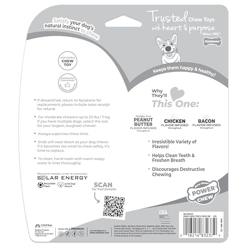 Nylabone Original Bone Power Chew Toy Value Pack for Dogs, Durable Dog Toys for Aggressive Chewers, Long Lasting Chicken, Bacon, and Peanut Butter Flavor, Small Dogs – Up to 25 Ibs, 3 Pack
