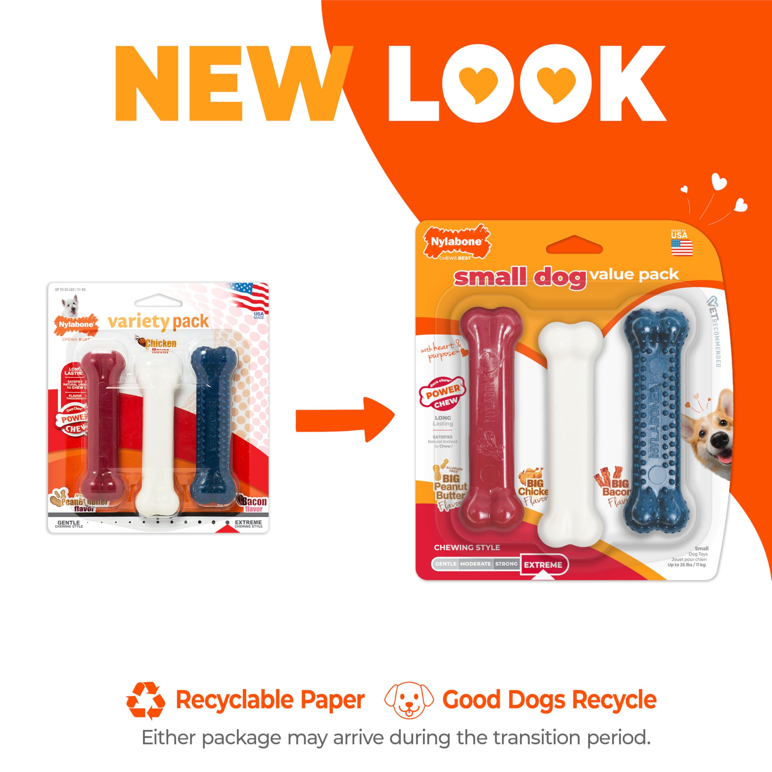 Our Power Chew Small Dog Value Pack features 3 chew toys to satisfy small, powerful chewers! Each heavy chewer dog toy in this pack is made of our toughest nylon material for long-lasting fun and features enticing flavor infused throughout that dogs simply can’t resist. Plus, these super chewer dog toys help clean teeth and freshen breath as your dog chews! Whether you want to give a dog toy for boredom, to help support your best friend’s dental health, or to simply provide a fun activity, these veterinarian-recommended chew toys are made with heart and purpose!