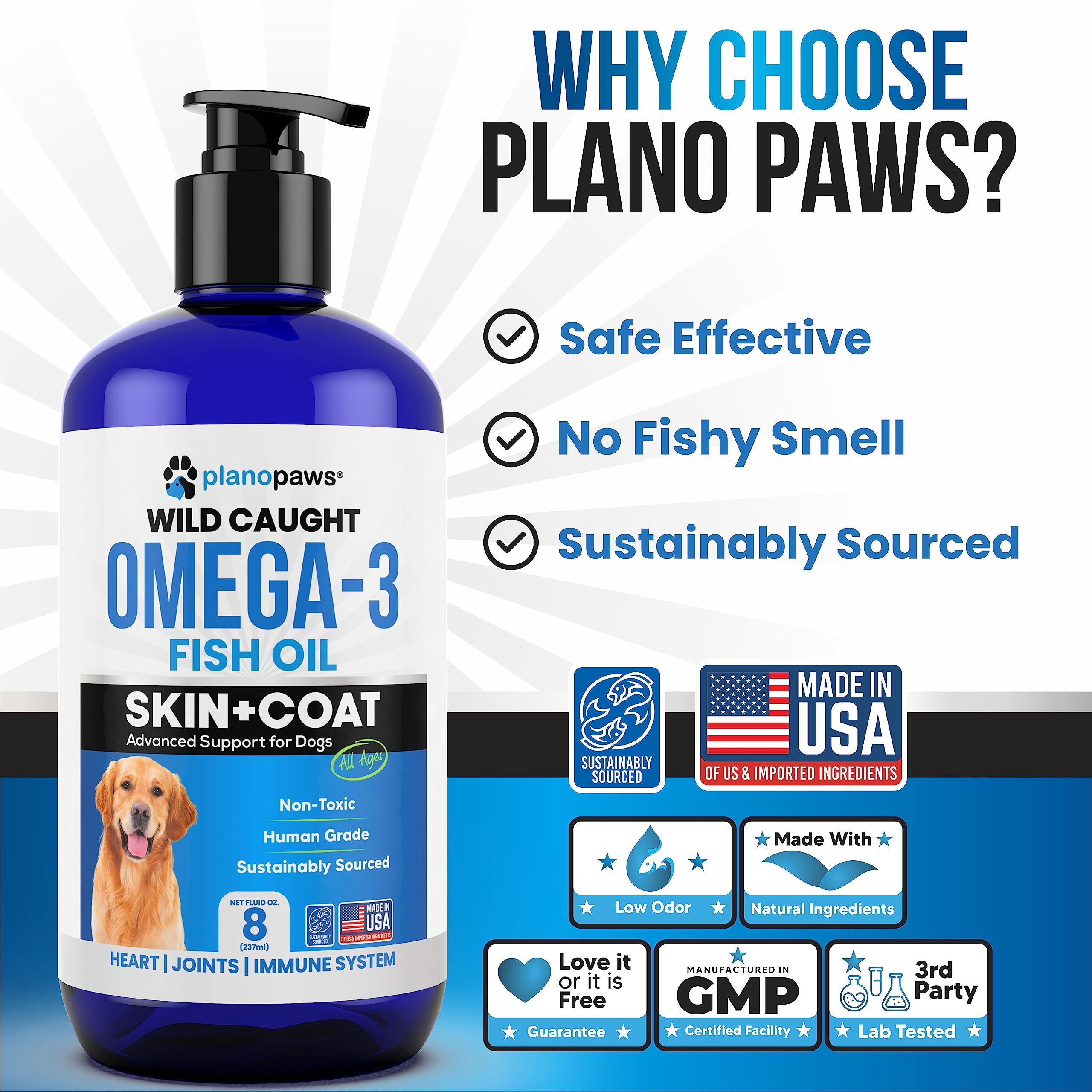 - Reduce Shedding + Improve Skin and Coat – Plano Paws Wild Caught Omega 3 for Dogs is made with pure Anchovies, Herring, Mackerel, and Sardines from the clear ocean waters off the coast of Iceland.