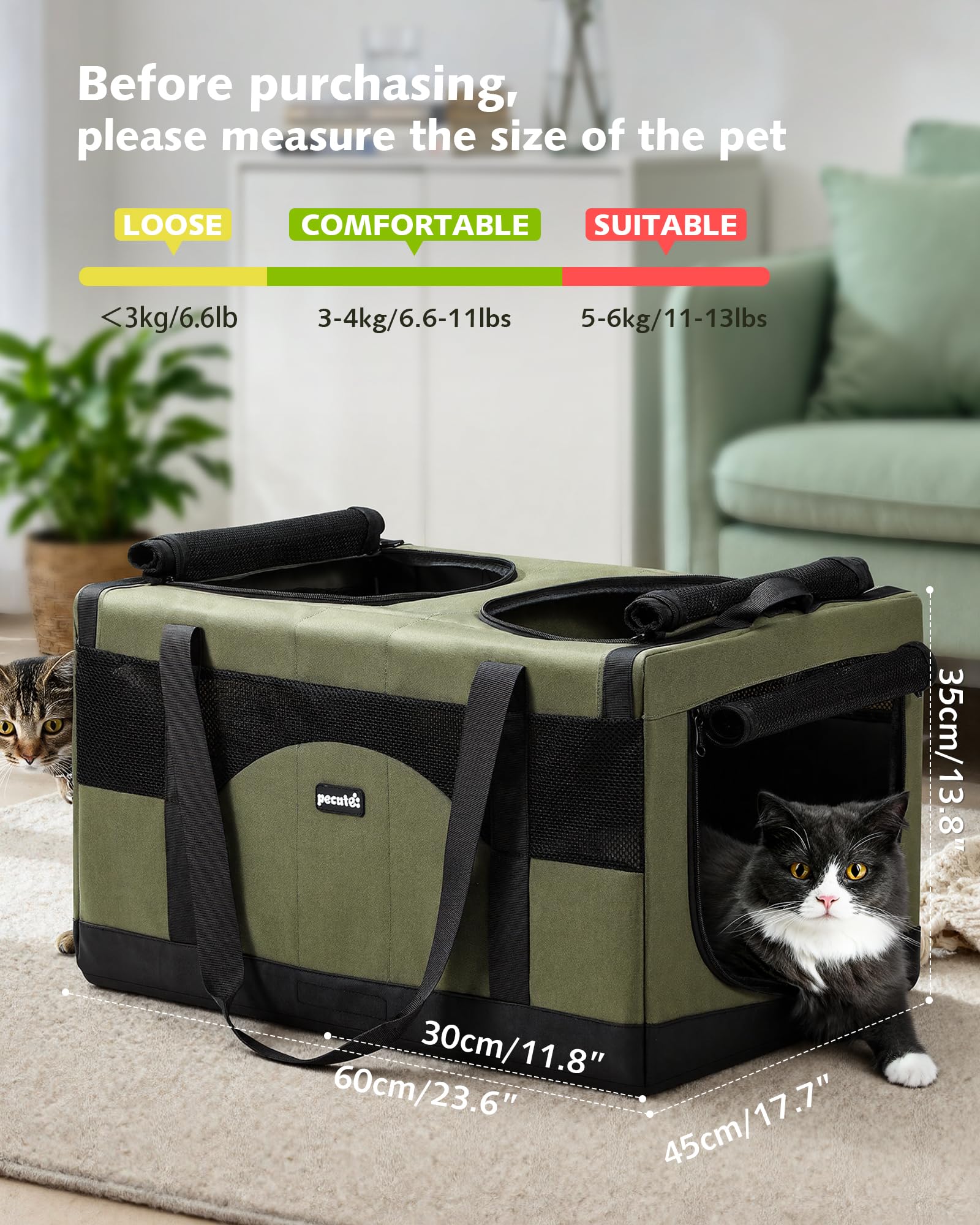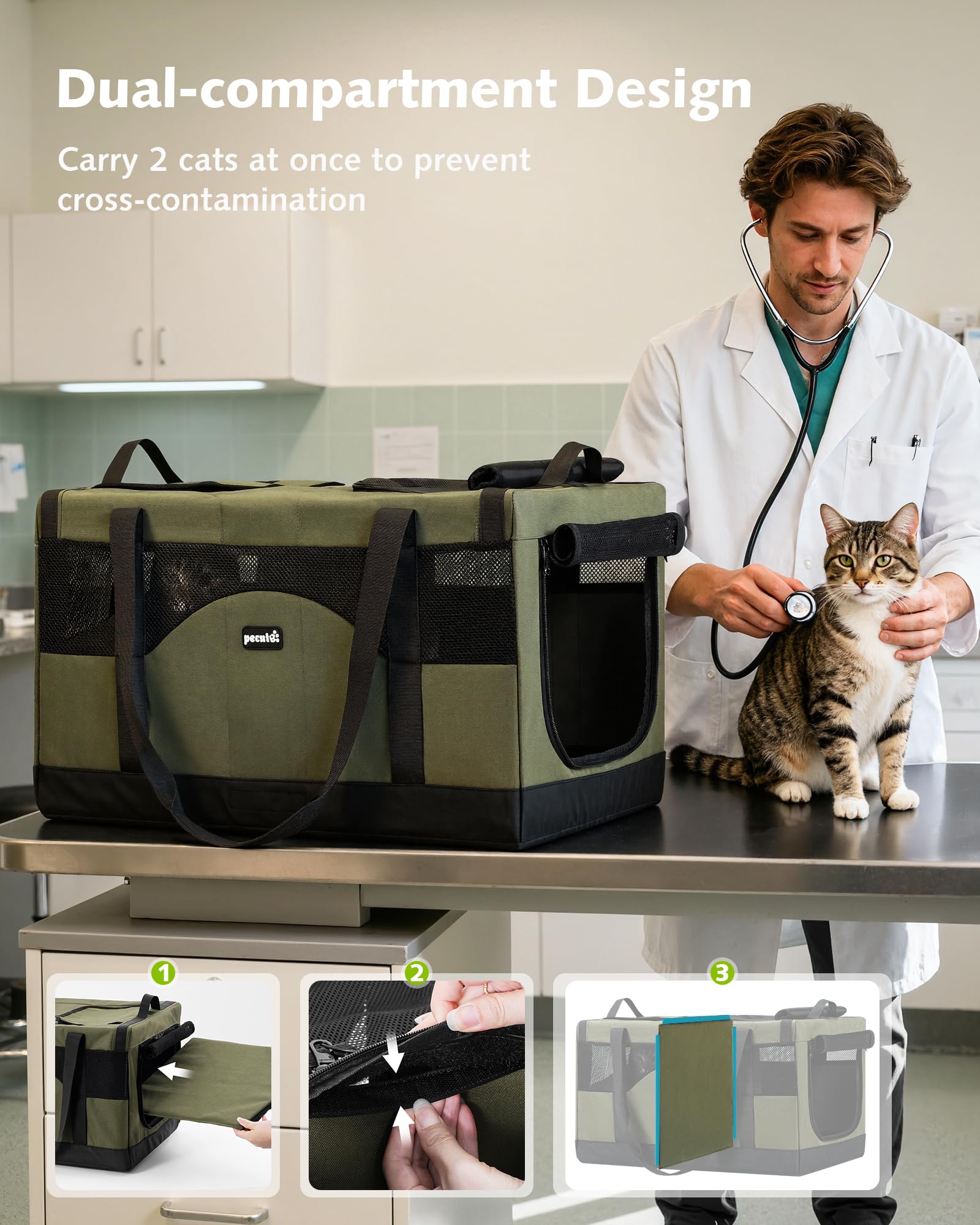 Pecute Cat Carrier for 2 Cats,Dual Cabin Multi Cat Travel Carrier with Removable Divider and Sturdy Frame,Collapsible,Soft,can Hold 20lbs+ for 2 Small Kitten,Medium Dog,Extra Large for Travel,Green