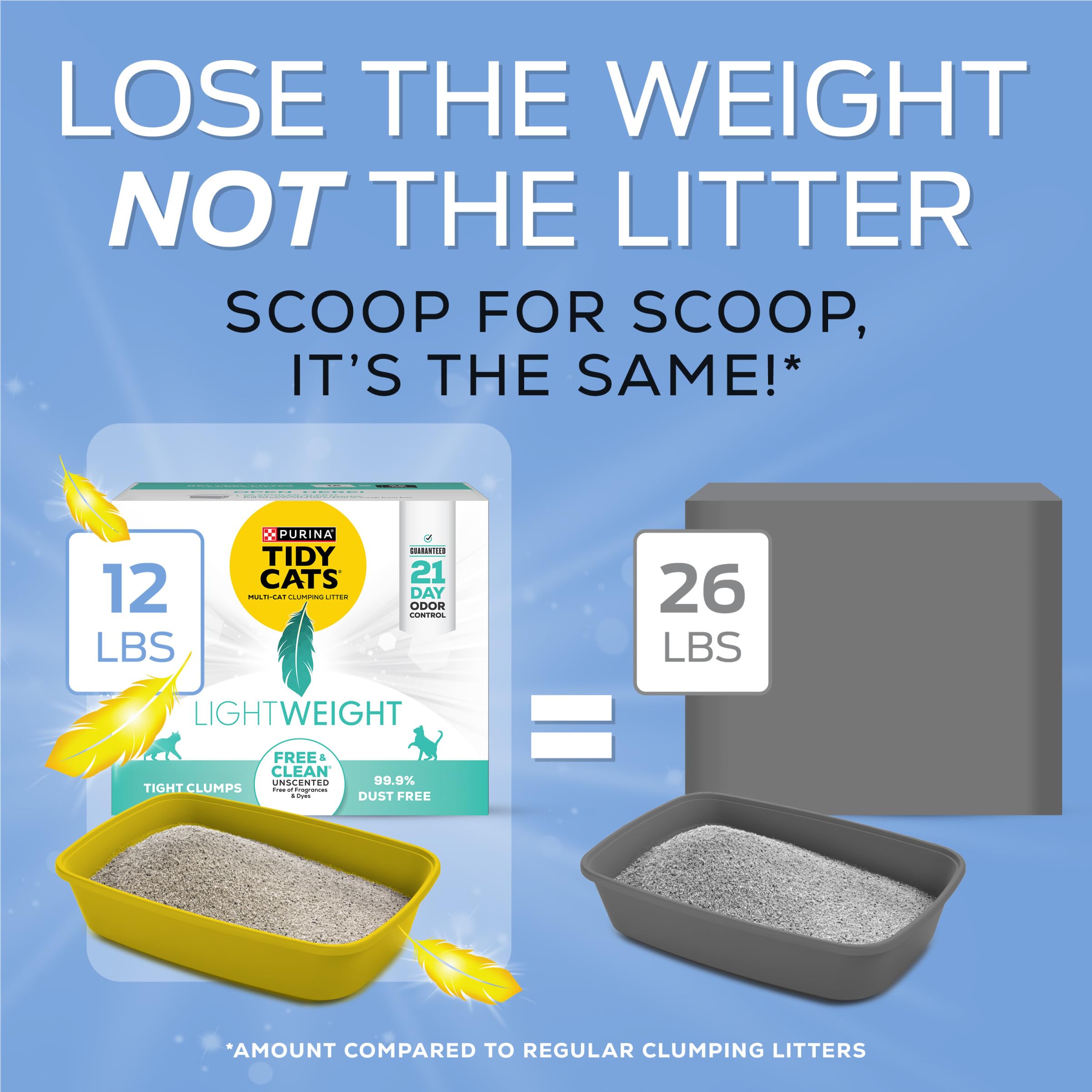 Details: Conquer litter box maintenance without the pain of litterback with Purina Tidy Cats LightWeight Free and Clean Unscented Cat Litter. This multi cat litter prevents ammonia odor for 21 days (when used as directed) while remaining free from dyes and fragrances—perfect for sensitive noses. Tidy Cats unscented litter is easy to carry, weighing half as much as the leading clumping cat litter while providing the same amount of litter. The low dust cat litter is easy to use and is 99.9 percent dust free and forms strong, tight clumps for quick and easy scooping and effortless litterbox maintenance. A good option for multi cat families, put this powerfully absorbent Tidy Cats litter into every cat litter box and make each one a welcoming place for your cats. Add Purina Tidy Cats LightWeight Free and Clean Clumping cat litter odor control to your cat’s litter box for the great formula you love and the performance and odor control you expect at a fraction of the weight.