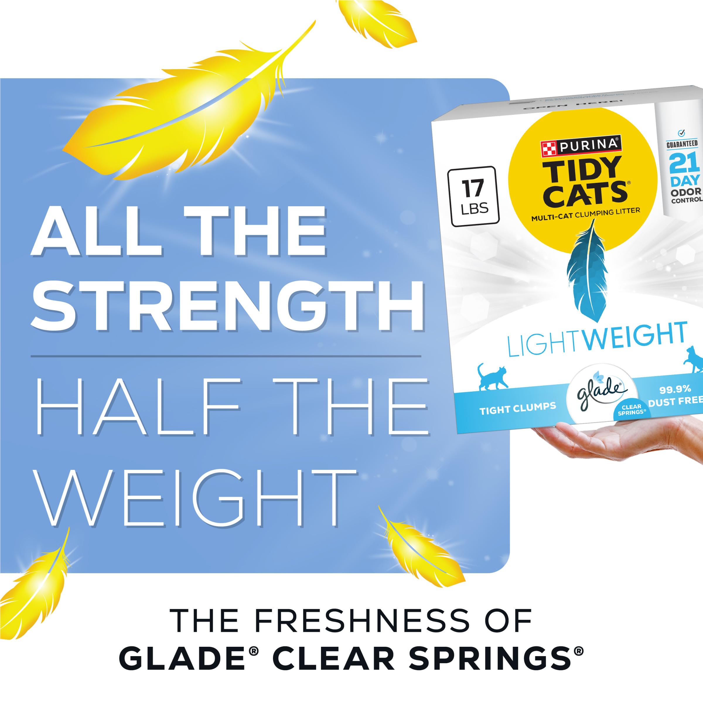 Details: Combine powerful odor control and a pleasant scent without the pain of litterback with Purina Tidy Cats LightWeight Litter With Glade Clear Springs Multi-Cat Clumping, scoopable cat litter. This multi cat litter prevents ammonia odor for 21 days (when used as directed) offering great odor protection with a fresh scent at a fraction of the weight. Tidy Cats litter is easy to carry, weighing half as much as the leading clumping cat litter without sacrificing litter amount. The low dust cat litter is easy to use and is 99.9 percent dust free and forms strong, tight clumps for quick and easy scooping. This multi cat litter offers an option for large cat families with a powerfully absorbent scented cat litter that can go into every cat litter box to make each box a welcoming place for your cats. Tidy Cats LightWeight With Glade Clear Springs clumping cat litter offers the powerful odor control you want with less weight.
