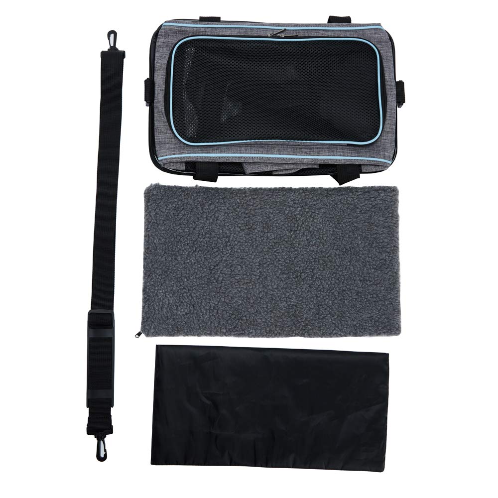 - Mesh windows for ventilation, top and side entry with locking zippers for safety. Carrying handles, adjustable shoulder strap which can also be used as seatbelt, and back strap can fasten the pet carrier to your luggage.